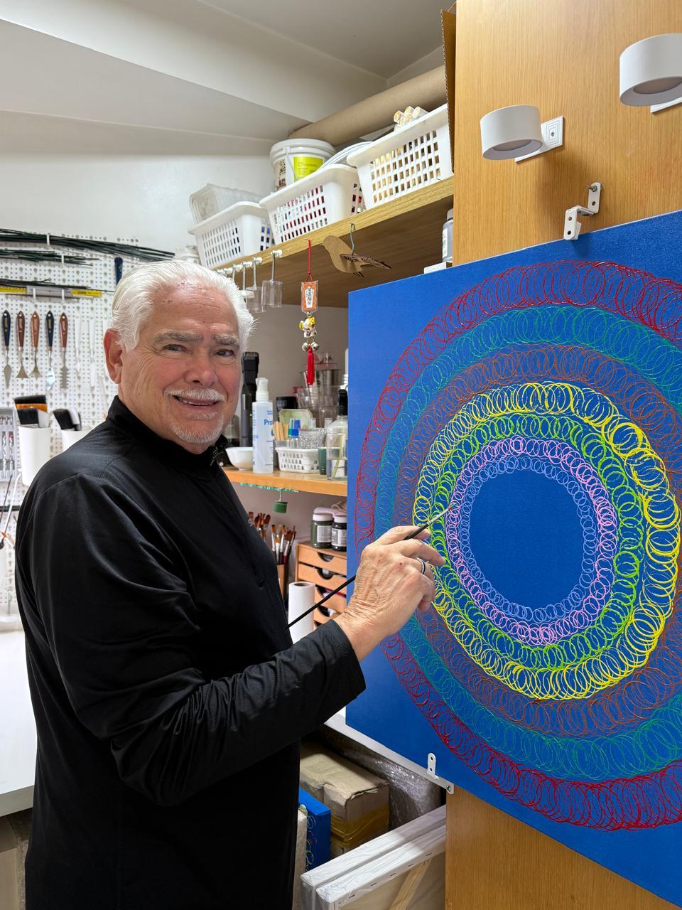 "Vez por outra eu tomava chá na casa dele, e foi ele que me incentivou a pintar. Uma vez ele me disse: 'Você sabia que Katsushika Hokusai começou a pintar com mais de 70 anos? Por que você aos 73 não começa a pintar? Mas quando fizer, crie um DNA, que nada mais é do que fazer seus quadros serem reconhecidos por um simples olhar. Procurei esse DNA bastante, e um dia me encontrei nos círculos, nas bolinhas, círculos preenchidos ou não que tendem a fazer o espectador pensar", destaca Germano.